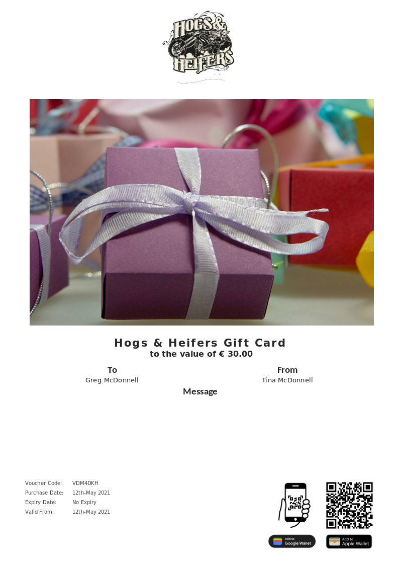 Hogs & Heifers allows you to purchase instantly printable gift vouchers, special offers and tickets using the Voucher Connect platform.